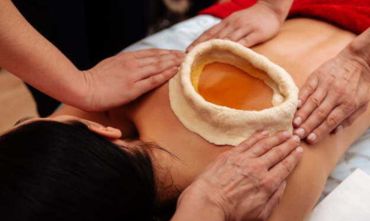 Applying lukewarm medicated oil on the waist.Benefit :- back pain, slip disc, sciatica compression